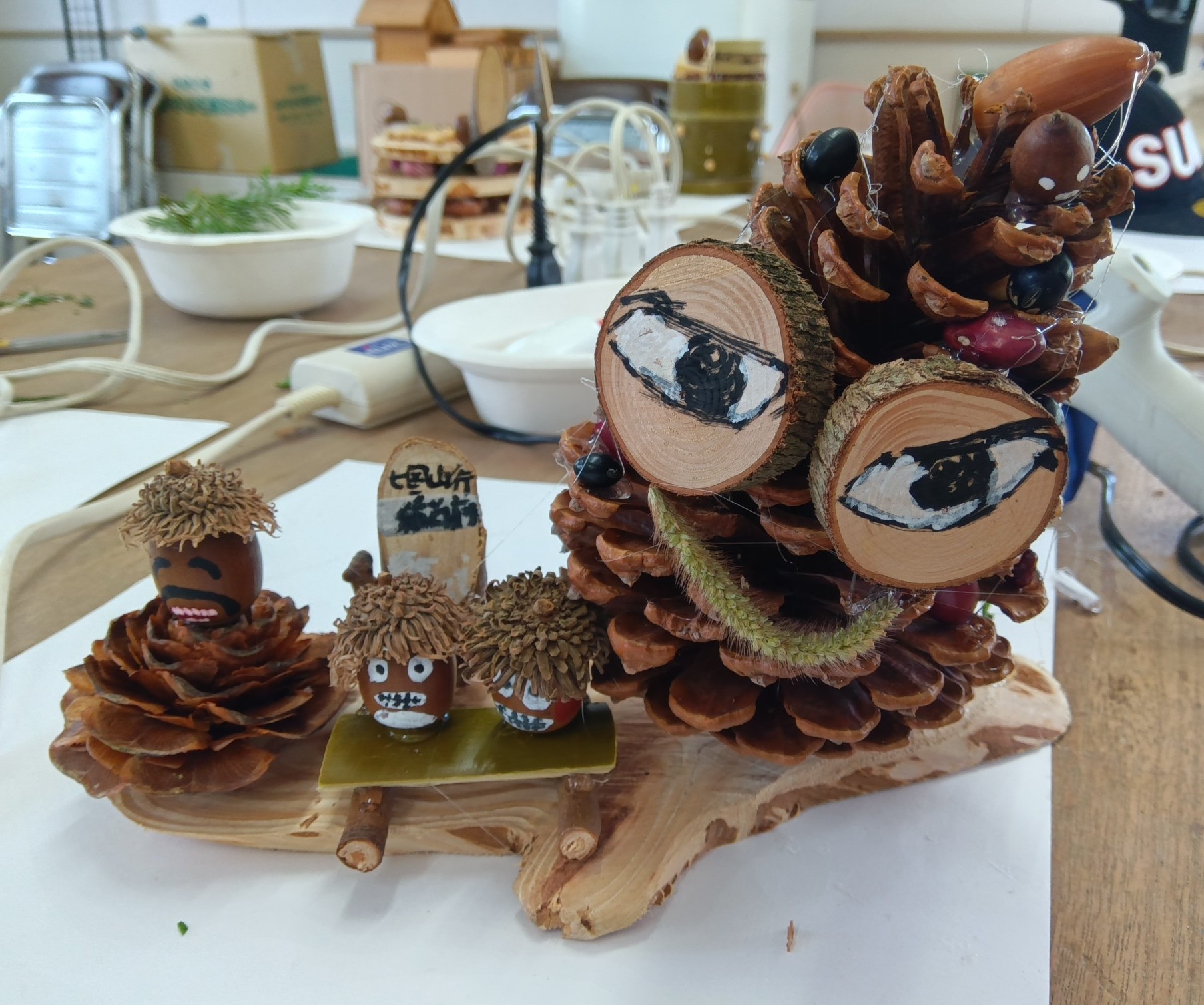 🍃2025 年 10 月 26 日 (日) 10 時 00 分 ~ 15 時 00 分🍃福岡県緑化センター(耳納deフェス)🍃緑化センターで繰り広げられる「みのうdeフェス」は、若者の歌声が響き渡り、そのステージを取り囲む形で所狭しと出店が並び、美味しそうな匂いが漂う中で毎年ネイチャークラフを実施してきました。会場からやや奥まったところに位置することもあって出足は鈍く、昼近くになって参加者が増え、スタッフは穴あけやカットなどで余裕がなくなってくるのが毎年の事でした。今回は、父親や小学校高学年以上の参加者には自らノコやドリルを使用してもらいました。おそらく、参加者にはより深く、作る喜びと達成感を味わってもらえたのではないかと推察します。