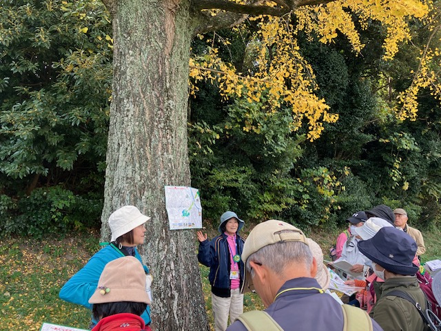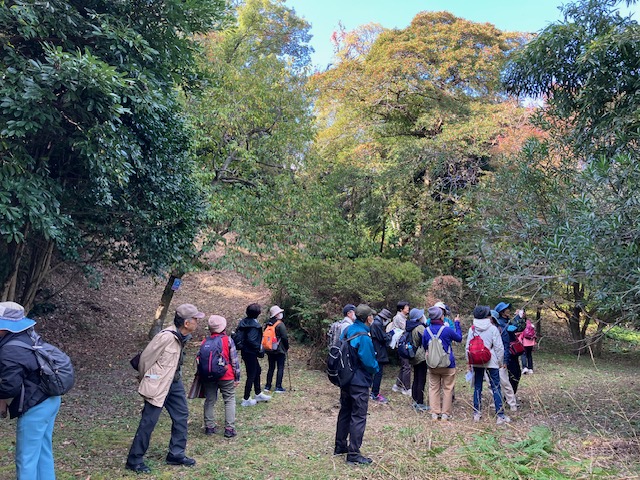 🍃2025 年 11 月 21 日 (金) 10 時 00 分 ~ 15 時 00 分🍃当日は、気持ちの良い秋晴れで23名の参加がありました。初めての方も2名ほどあり、和やかな雰囲気で水城駅をスタート。住宅街を抜けるとすぐに水城址があり、そこで行程と水城堤防が作られた歴史背景等を説明。四王寺の山城は知っていても、水城の堤防については予備知識もない方がほとんどで、興味深く資料を見たり質問をされたりする方が多かったです。往復とも平坦な道のりで、車も通らないためご高齢の方にもちょうどよいコースでした。途中、樹木ではクロキ、カクレミノ、ネズミサシ、コナラ等のところで解説をしました。山のように落ちているどんぐりを見ながら「本州の熊にもっていってあげたいね」と言う優しい皆さんでした。国道沿いの広場はベンチもトイレも完備でゆっくり昼食をとり、復路では線路を越えて水城堤防の断面が見れる場所を通り、川で途切れる端まで行き、全体を見渡しながら解説、古代を想像してもらいました。草花も特に珍しいものがあったわけではありませんが、足元を見て一つ一つ立ち止まり、秋の植物を味わっておられる様子が見られました。