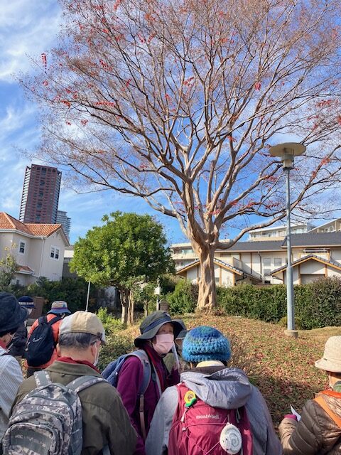 🍃2025 年 12 月 19 日 (金) 10 時 00 分 ~ 15 時 00 分🍃当日は風もなく、季節外れの暖かい一日で、最高のお散歩日和でした。パイオ集合場所の西鉄香椎花園駅から2-3分で高取神社。裏手のフェンス越しに照葉樹の社寺林を観察。隣り合った遊園地跡に繁茂する落葉広葉樹(パイオニア種)の明るい木々と見比べて、森の遷移を実感できました。10分ほどで「あいたか橋」に到着、水鳥類のバードウオッチングを始めました。残念ながらこの時刻が満潮で、見られた鳥が少なかったうえ、すぐ潜ってしまう種類が多く、カンムリカイツブリは双眼鏡でも見るのが大変でした。次はアマモの藻場作り事業の解説版に移動、「海の森」とも呼ばれる藻場の働きについてお話しました。 ここから香椎照葉1丁目の瀟洒な住宅街に入って、街路や庭に植栽された木々を観察、名残の紅葉や種子、常緑樹の花などが迎えてくれました。シンボルツリー的存在のシマサルスベリには一同圧倒されました。皆さん落ち葉を拾って紅葉を偲んでいました。独特な非対称の葉をつけるニレ科のアキニレは元気に黄葉していました。中央公園に進んで修景池で水鳥を探したのですが、カルガモ数羽にアオサギ一羽といったところでした。