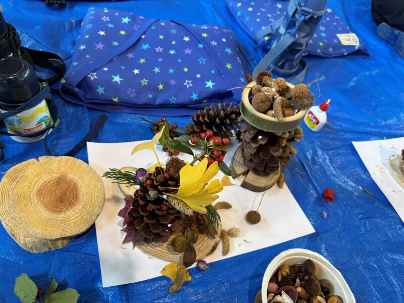 🍃2025 年 11 月 26 日 (水) 08 時 30 分 ~ 10 時 30 分🍃1年生3クラス95人🍃福岡市内の小学校で1年生を対象にネイチャークラフトを実施するのは初です。どんな反応があるか楽しみにしていましたが、期待に違わず、個性豊かな作品がどんどん生まれました。今まで見たことのない木の実や形、これまで嗅いだことのない木の枝の香りなどに振れ、自然の素材に親しみを抱いている、そんな風景が広がっていました。こうした素材は森からの贈り物だということを感じ取り、森への愛着を深めてくれたらと願います。