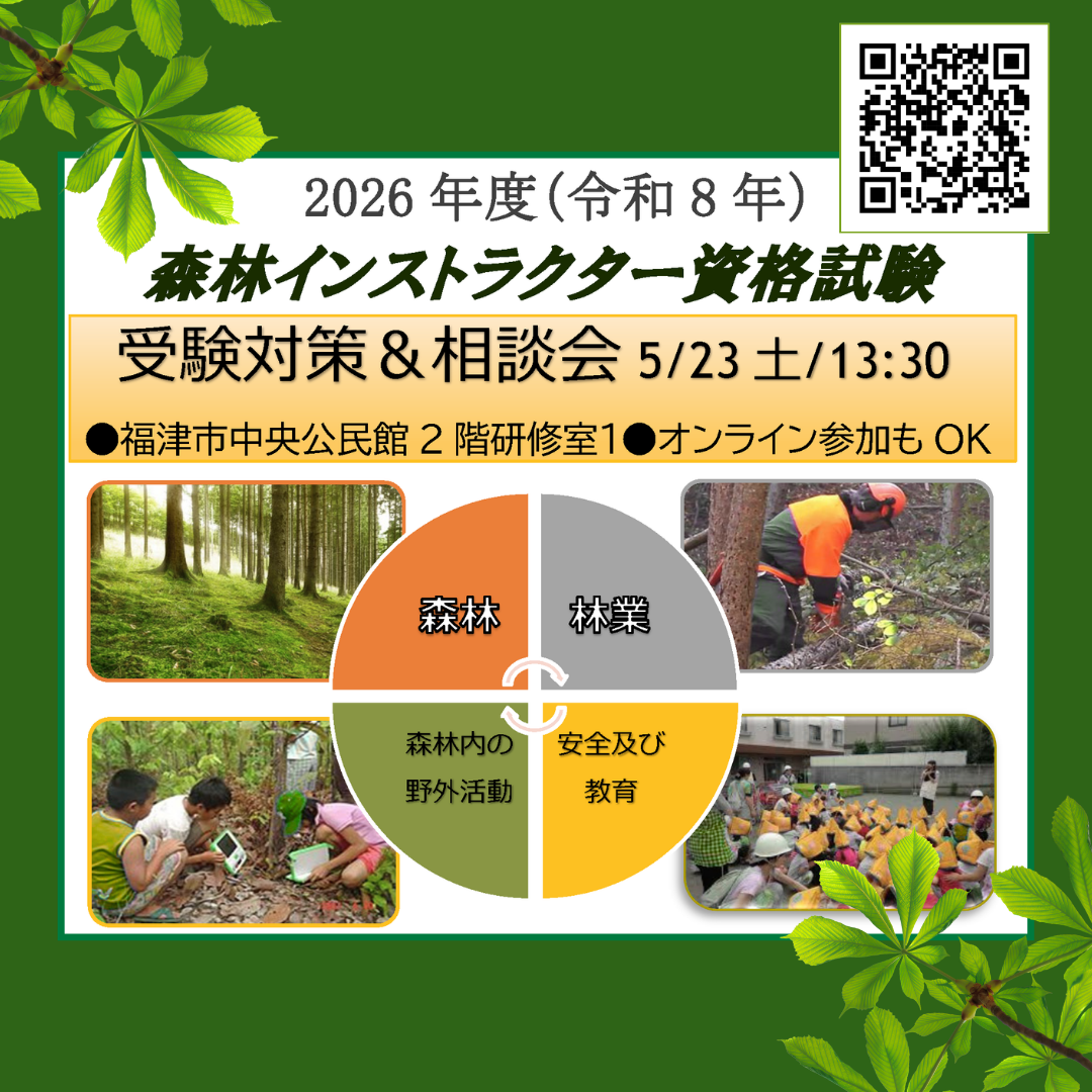 森林インストラクター資格試験受験対策&相談会 イベント 2026.04.09 🍃2026年5月23日土曜日13時半から16時まで、福津市中央公民館2階研修室1にて、2026年度森林インストラクター資格試験の受験対策&相談会を開催します。森林インストラクターの資格を取得し、自然の大切さ・おもしろさを伝えてていきませんか?