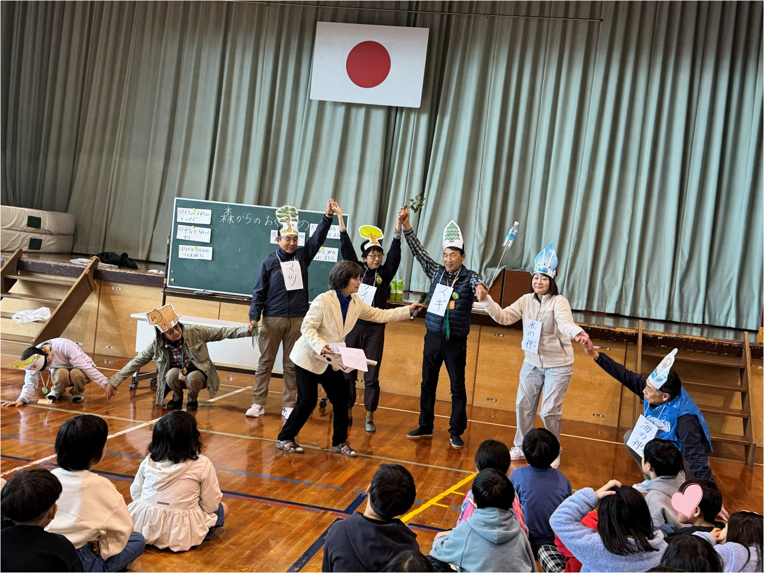 いよいよクラフト開始。グルーガンの使い方・材料の取り方等、作業注意をよく聞いていたことが伺えました。作品は、豊かな発想を思う存分発揮した素晴らしいものばかりで溢れました。森の講話では、今回3回目の公演となる劇団モリリンの名演技で、楽しくわかりやすく森の働きの全体像が伝わったのではないでしょうか!!自然環境を守り育てていくために、これから自分たちにできることは何かを考え、実行してくれるのではないかと、ふりかえりの子どもたちの感想やまとめからも、そう確信しました。