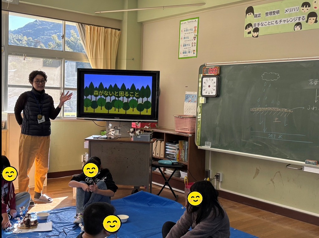 🍃2026 年 2 月 3 日 (火) 10 時 30 分 ~ 11 時 30 分🍃5年生、13人🍃5年生の教室でクラフト事業を実施しました。教室が3階にあったため、材料の運び入れに伴う往復が懸念されましたが、先生方や児童の皆さんが手伝ってくださり、結果的にとてもスムーズに搬入することができました。アイスブレイクの導入では、ダンゴムシが昆虫ではなくエビやカニの仲間であることを紹介すると、驚いた様子の反応が多く見られました。ネイチャークラフトでは、シーダローズやセンニチコウなど花の形を生かした素材が特に人気で、木に咲く花をイメージした作品が多く見られ、木っ端を工夫してウミガメのような作品に仕上げる児童もいました。また、学年に合わせて林業の話も取り入れ、「森からのおくりもの」をテーマに、模型を使って雨が森に染み込む様子を再現する実験を交えた講話で締めくくりました。終了後も、時間ぎりぎりまで粘り強く作品を仕上げようとする児童の姿が印象的でした。