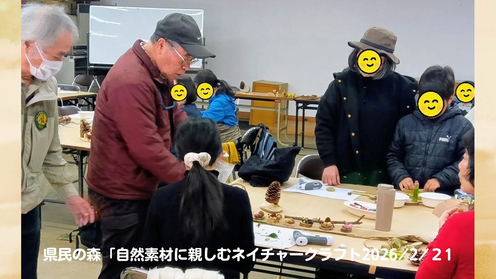 🍃2026 年 2 月 21 日 (土) 10 時 00 分 ~ 12 時 30 分🍃四王寺県民の森学習研修会🍃小さな子ども連れの家族、小中学生とお母さん、気の合う友達同士の大人の方々等、参加者22名。沢山の種類の材料を見て、皆さんテンション上がり制作意欲もUP!!無心に木片や竹、木の実に向き合い、唯一無二のネイチャークラフト作品の出来上がり~。