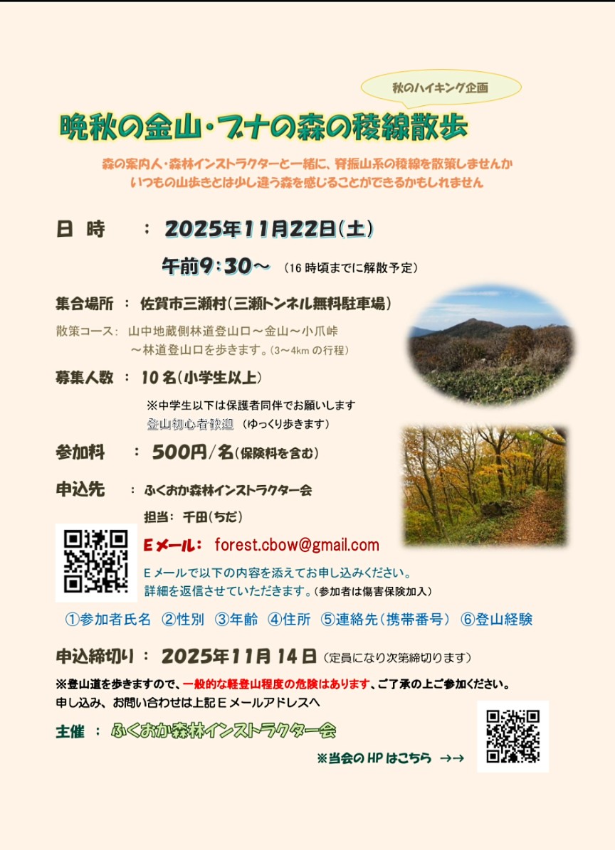 自主企画:晩秋の金山・ブナの森の稜線散歩2025 イベント 2025.10.18 🍃2025 年 11 月 22 日 (土) 09 時 30 分 ~ 15 時 00 分🍃場 所:福岡市・佐賀市県境・脊振山系金🍃参加対象:一般(10名程度)🍃参加費:500円(保険料等)🍃脊振山系・金山を佐賀県側から登り、ブナの森の稜線を歩く軽登山。沢沿いや縦走路の植物、動物を観察しながら脊振の自然について解説します。